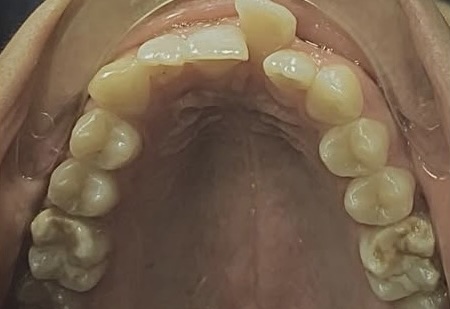Upper crowded and twisted teeth. Comprehensive orthodontic treatment was performed, including whitening. The patient was able to smile again with confidence.